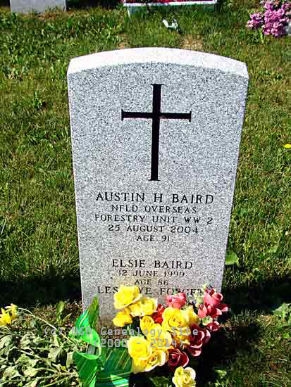 | Austin H. Baird Newfoundland Overseas Forestry Unit WW II 25 Aug 2004 Age 91 Elsie Baird 12 Jun 1999 Age 86 Lest We Forget |