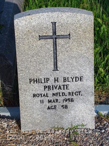 | Philip H. Blyde Private Royal Newfoundland Regiment WW I 11 Mar 1958 Age 58 |