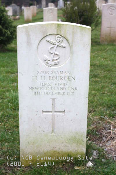 Seaman H. H. Bourden H.M.S. Vivid Newfoundland Royal Navy Reserve Plymouth [Ford Park] Cemetery United Kingdom |