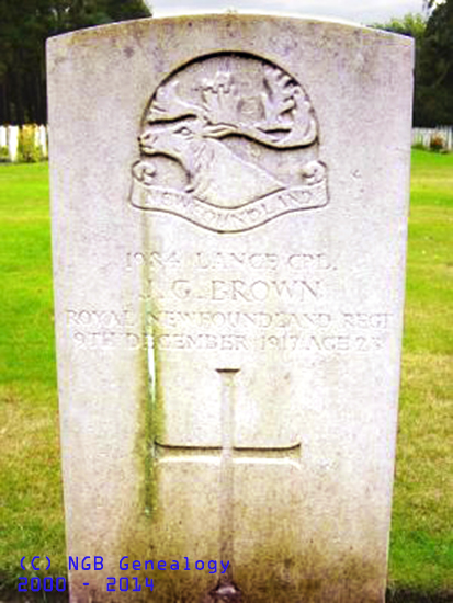 | 1984 Lance Corporal James G. Brown Royal Newfoundland Regiment 9 Dec 1917 Age 23 Brookwood Cemetery Surrey, England |