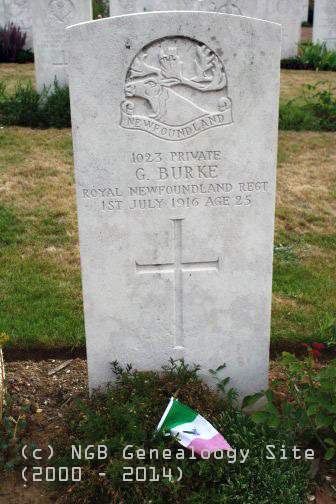 | 1023 Private G. Burke Royal Newfoundland Regiment 1st July 1916 Age 25 |