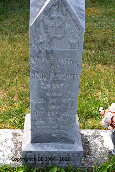 | JANE ELIZABETH BURSEY Born: Dec 24th 1877 Died: Oct 23rd 1951 ANANIAS STANLEY BURSEY Died: March 23rd 1953 Aged: 73 Years |