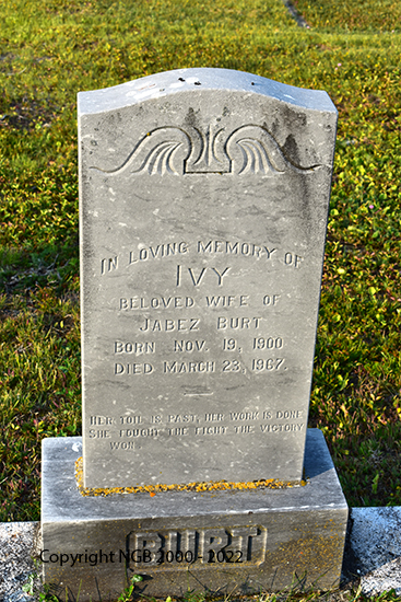 | IVY BURT Born: Nov 19, 1900 Died: March 23, 1967 Beloved Wife of Jabez Burt |