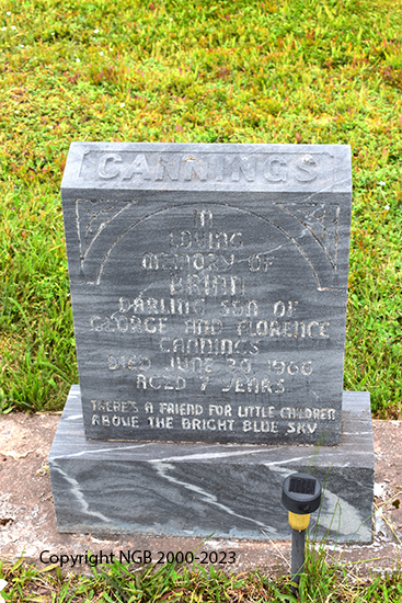 | BRIAN CANNING Died: June 20, 1966 Aged: 7 Years Darling Son of George & Florence Canning |