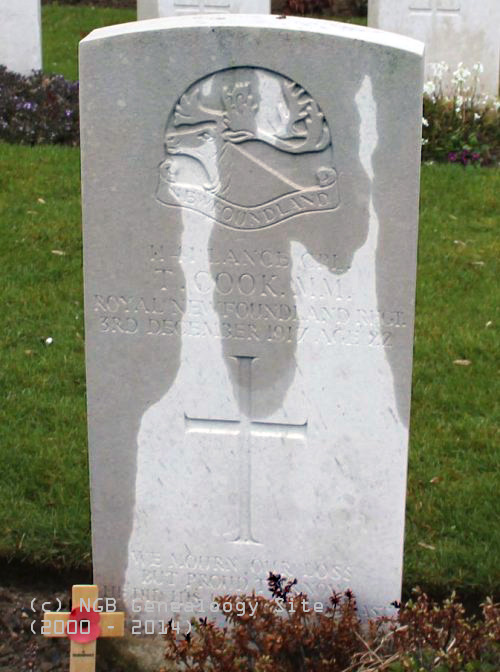 | 1441 Lance Corporal T. Cook MM Royal Newfoundland Regiment 3 Dec 1917 Age 22 ~ We Mourn Our Loss But Proud To Know He Did His Duty Until The Last |