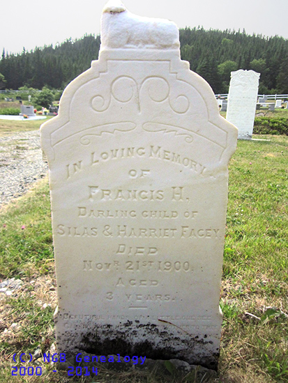 | FRANCIS H. FACEY Died: Nov 21st 1900 Aged: 3 Years Darling Child of Silas & Harriet Facey |