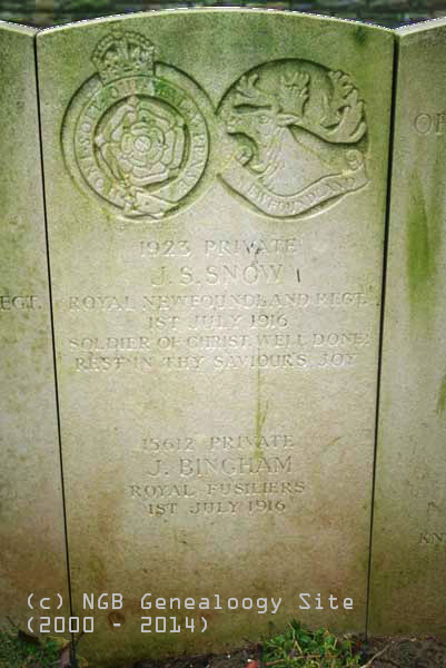 | Regt # 1923 Pte John S. Snow Royal Newfoundland Regiment 1st Jul 1916 Soldier of Christ Well Done Rest In Thy Saviors Joy |