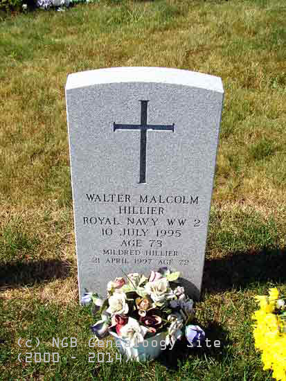 | Walter Malcolm Hillier Royal Navy WW II 10 Jul 1995 Age 73 Mildred Hillier 21 Apr 1997 Age 72 |