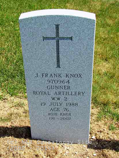 | 970964 J. Frank Knox Gunner - Roya Artillery WW II 19 Jul 1988 Age 76 Rose Knox 1911-2002 |