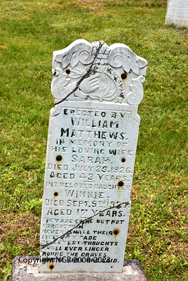 | SARAH MATTHEWS Died: July 23, 1926 Aged: 43 Years Their Daughter WINNIE MATTHEWS Died: Sept 9, 1927 Aged: 17 Years |