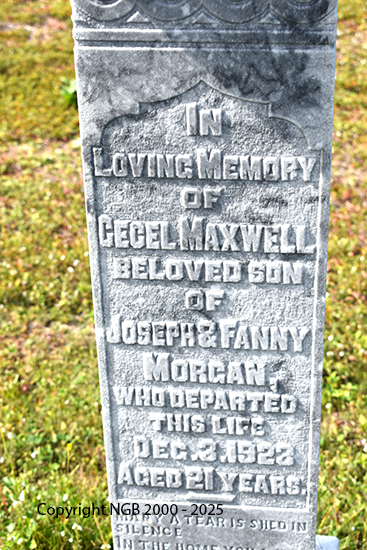 MAXWELL MORGAN Died: Dec 3, 1923 Aged: 21 Years Beloved Son of Joseph & Fanny Morgan |