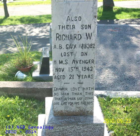 | Richard W. Newell A.B. G/JX 188382 Lost on H.M.S. Avenger Nov 15th 1942 Aged 21 Years ~ Greater Love Hath No Man Than This That a Man Lay Down His Life For His Friens |