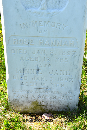 | ROSE HANNAH PAYNE Died: Jan 2, 1897 Aged: 13 Years MINNIE JANE PAYNE Died: Jan 3, 1897 Aged: 8 Years Beloved Daughters of Esau & Sarah Jane Payne |