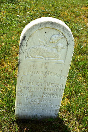 | VIOLET VERA RECCORD Died: June 9, 1922 Aged: 9-1/2 Years Darling Child of Esau & Sarah Reccord |