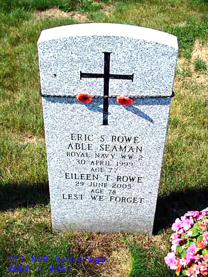 | Eric S. Rowe Able Seaman - Royal Navy WW II 30 Apr 1999 Age 77 Eileen T. Rowe 29 June 2005 Age 78 Lest We Forget |