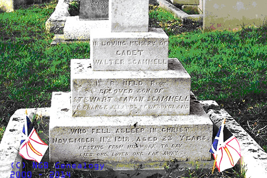 | 2958 Cadet Walter Scammell Royal Newfoundland Regiment Beloved Son of Stewart and Sarah Scammell Change Islands,Newfoundland Who Fell Asleep In Christ 11 Nov 1918 Age 21 Resting From His Work Today Lies One Loved, One Far Away |