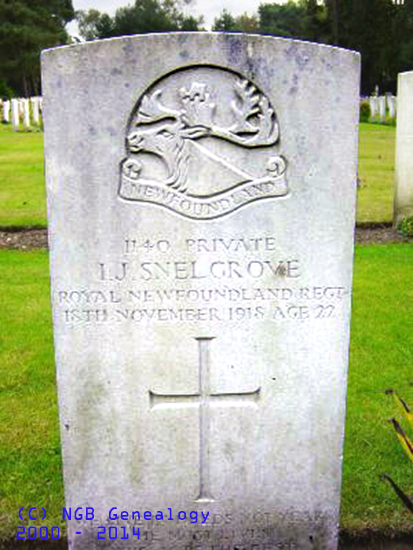 | 1140 Pte Isaac J. Snelgrove Royal Newfoundland Regiment 18 Nov 1918 Age 22 Brookwood Cemetery Surrey, England |