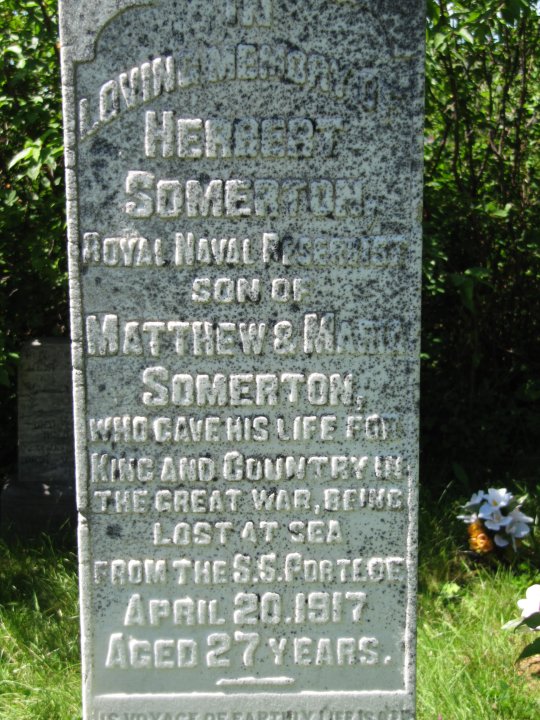 | Herbert Somerton Royal Naval Reservist Son of Matthew & Maria Somerton Who Gave His Life For King and Country in The Great War, Being Lost at Sea From The S.S. Portloe Apr 20, 1917 Aged 27 Years |