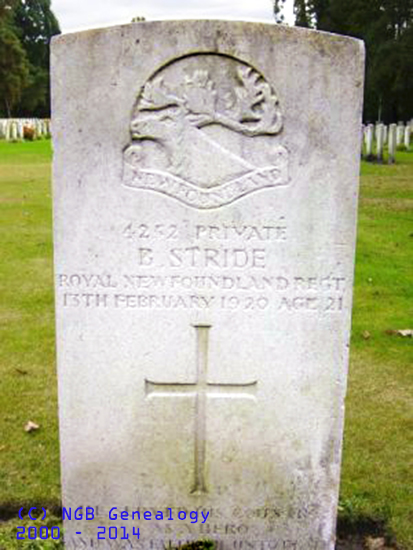 | 4252 Pte Bransome Stride Royal Newfoundland Regiment 13 Feb 1920 Age 21 Brookwood Cemetery Surrey, England |
