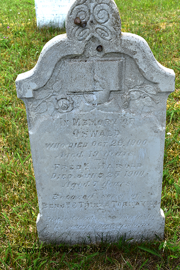 | OSWALD TORRAVILLE Died: Oct 25, 1900 Aged: 19 Years FRED HAROLD TORRAVILLE Died: June 25, 1900 Aged: 7 Years Beloved Sons of Benjamin & Thirza Torraville |