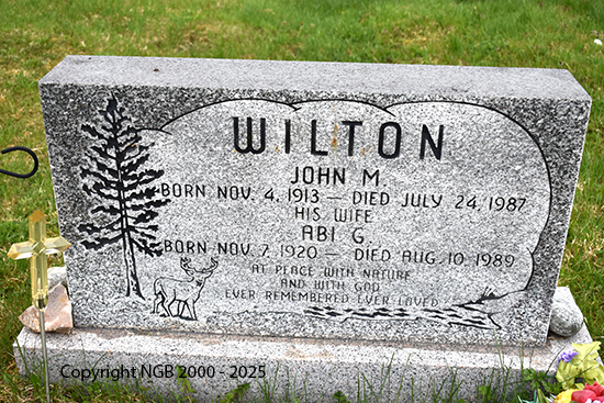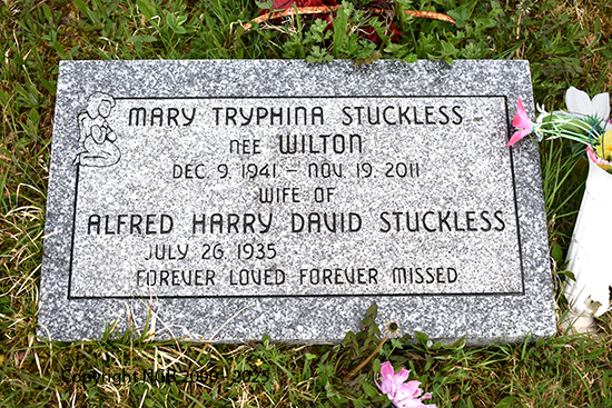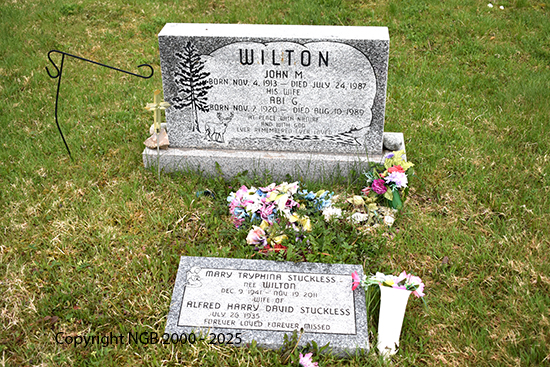 | JOHN M. WILTON Born: Nov 4, 1913 Died: July 24, 1987 ABI G. WILTON Born: Nov 7, 1920 Died: Aug 10, 1989 MARY TRYPHINA STUCKLESS (Nee WILTON) Born: Dec 9, 1941 Died: Noov 19, 2011 Wife of Alfred Harry David Stuckless |
