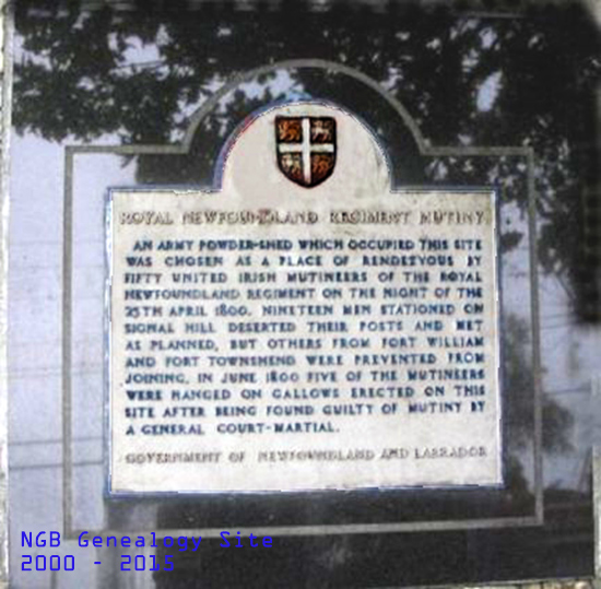 An Army powder shed which occupied this site was chosen as a place of rendezvous by fifty United Irish mutineers of the Royal Newfoundland Regiment on the night of the 25th April 1800. Nineteen men stationed on Signal Hill deserted their posts and met as planned. But others from Fort William and Fort Townshend were prevented from joining. In June 1800, five of the mutineers were hanged on gallows erected on this site [now corner of Barnes Road and Belvedere Street] after being found guilty of Mutiny by a General Court-Martial |