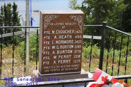 | Pte. N. Croucher | 1425 | Pte. A. Heath | 1166 | Pte. L. Normore | 2425 | Pte. W.G. Burton | 3199 | Pte. A. Burton | 3776 | Pte. W. Perry | 2218 | Pte. A. Perry | 1273 | Erected by Hector Short and the People of Beaumont |