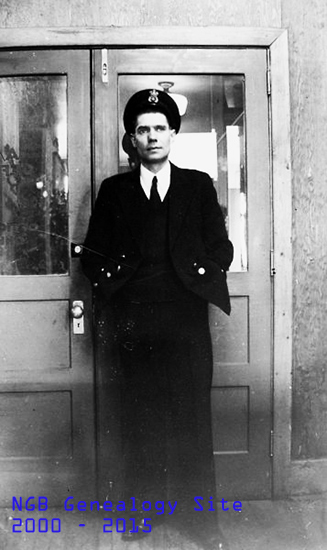 George Ettie at HMCS Avalon [glass door reads A/S Office, Officers Only]
