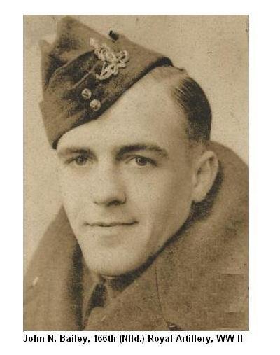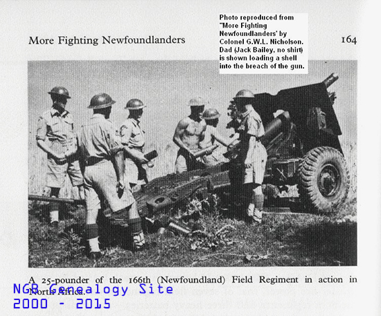 John Nelson Bailey, Regiment # 970313, Jack, as he was known, had been in the CLB for nine years before joining up at age 20. He had attained the highest rank he could in that organization. He was a Sergeant. The CLB was an Anglican organization and Jack was Methodist. His paramilitary training in the CLB helped his rise to Sergeant in the regiment. Jack had very little formal education, having left school in the sixth book to help his widowed mother by working where he could. He was recognised mostly for his street smarts and common sense. He had sustained two injuries that we know of. One was a very bad burn from a boiler explosion in Scotland during training exercises. This left him in hospital for several months before being shipped out with the rest of the regiment to North Africa. His second was being struck by a piece of shrapnel, which left him with a piece missing from his lip and a broken tooth. Upon his return to Newfoundland he married his childhood sweetheart, whom he had been dating before he went overseas. Jack and "Ginger" had two children and 3 grandsons before his passing in 2004. His beloved "Ginger" (Viola) passed in 2013. |