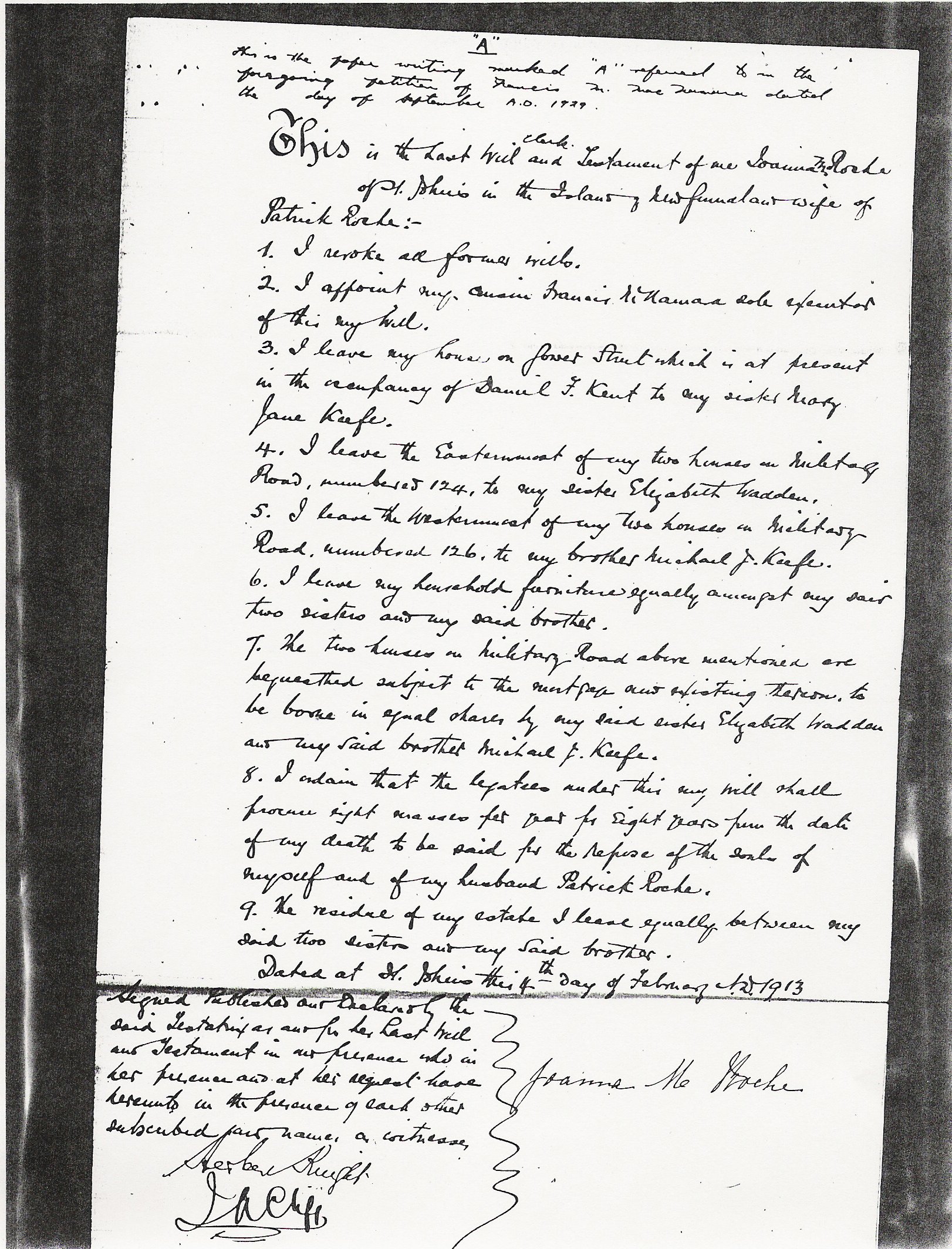 Last Will and Testament of Joanna M. (Keefe) Roche, Widow of Patrick Roche - St. John's