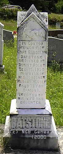 In Loving Memory Of Capt. Randolph Batstone drowned at Burnt Point Dec. 15, 1930 in the wreck of his schooner Warren M. Colp Aged 38 yrs 5 mons Erected by his wife and daughter |
