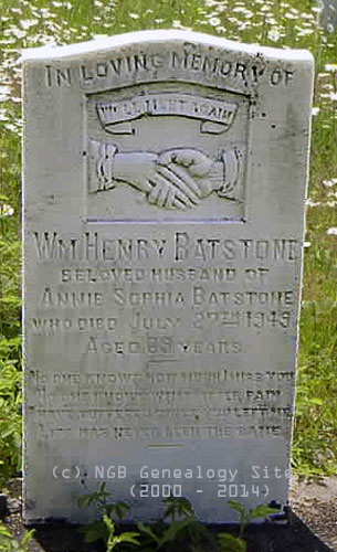 In loving Memory of Wm. Henry Batstone beloved husband of Annie Sophia Batstone who died July 27th, 1949 Aged 69 years No one knows how much I miss you No one knows what bitter pain I have suffered since you left me Life has never been the same |