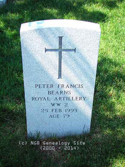| Peter Francis Bearns Royal Artillery WW II 25 Feb 1993 Age 79 |