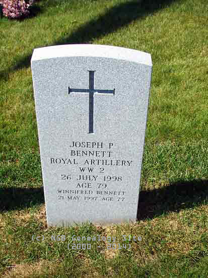 | Joseph P. Bennett Royal Artillery WW II 26 July 1998 Age 79 Winnifred Bennett 21 May 1997 Age 77 |