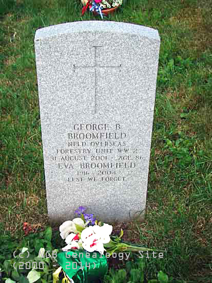 | George B. Broomfield Newfoundland Overseas Forestry Unit WW II 31 Aug 2001 Age 81 Eva Broomfield 1916-2004 Lest We Forget |