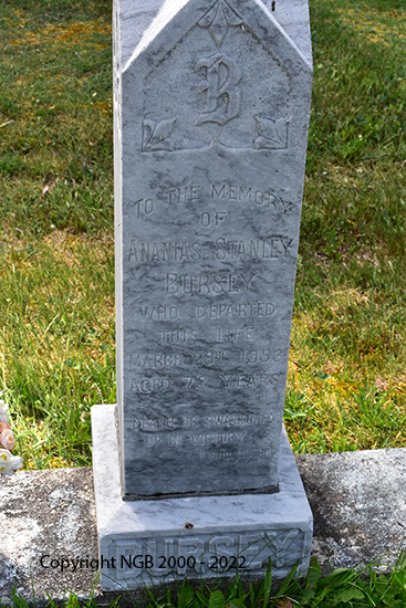| JANE ELIZABETH BURSEY Born: Dec 24th 1877 Died: Oct 23rd 1951 ANANIAS STANLEY BURSEY Died: March 23rd 1953 Aged: 73 Years |