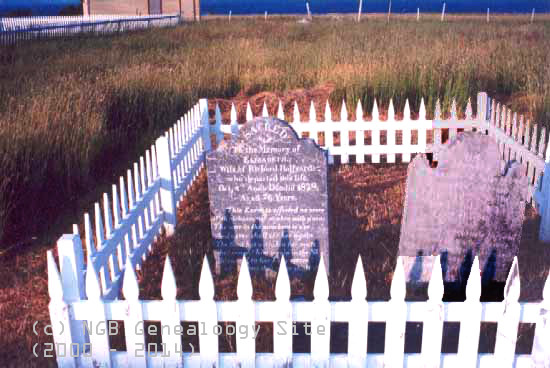 Located on the Roy HALFYARD property, just off the Wharf Road, It is believed that there were a number of other burials at this site, but no one knows who they are, or how many there were! The three markers above are the only ones at the site. Two grandsons of Richard & Elizabeth, Richard Stephen d 1837, age 17 and Richard d 1842, age 30, are both buried in the Methodist/United Cemetery, so Elizabeth may well have been the last person to be buried at this site. | ||