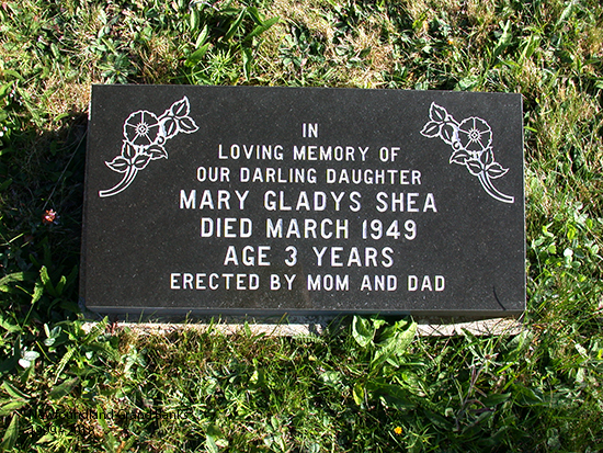 | SHEA | MARY GLADYS | March 1949 | 3 Months | In loving memory of our darling daughter Erected by Mom and Dad |