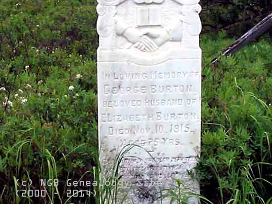 | In loving memory of George BURTON, beloved husband of Elizabeth Burton. Died November 10, 1915 . Age 75 years. | |
