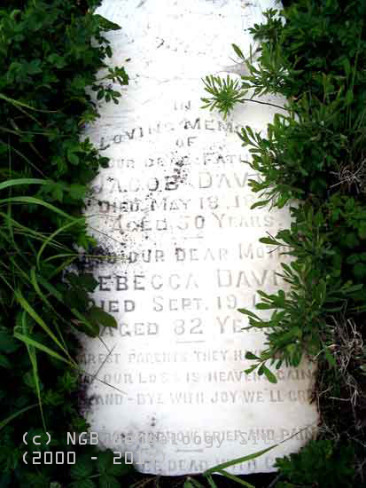 | In loving memory of our dear father Jacob DAVIS. Died May 18, 1891 , age 50 years. And our dear mother Rebecca DAVIS. Died September 19, 1922 . Age 82 years. | Year of death for Rebecca provided by transcriber |