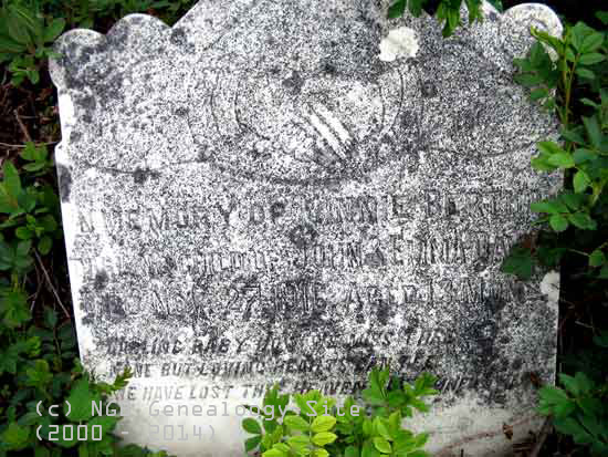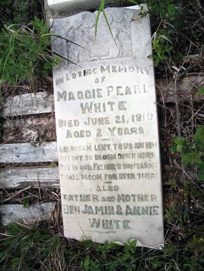| In loving memory of Maggie Pearl WHITE. Died June 21 1919 age 2 years. Also father Benjamin White and mother Annie White. | Benjamin and Annie WHITE are actually buried in Corner Brook Newfoundland. |