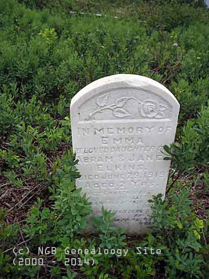 | In memory of Emma ELKINS beloved daughter of Abram and Jane Elkins. Died June 29, 1919. Age 2 years. | |