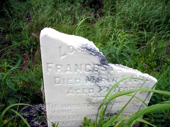| I visited Safe Harbour in June 2000. It is now abandoned, except for a few cabins. This cemetery is located on the hill where the Church once stood. It is the older of the two UC Cemeteries.Parts of an old fence still remain, but because the cemetery was so overgrown (bushes waist-high) I may easily have missed some of the headstones. This transcription was done in memory of my father's sister, Emma ELKINS, who is buried here. There could be errors in these transcriptions and some headstones were very difficult to read, so please verify the information through other sources if possible. (Linda Elkins-Schmitt) | |