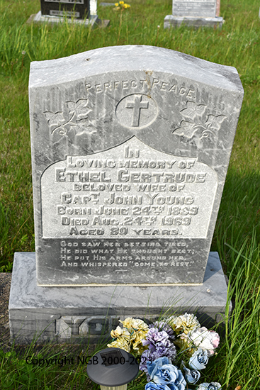 | YOUNG # | Ethel Gertrude | June 24th 1889 | Aug 24th 1969 | 80 | Beloved Wife of Capt. John Young |