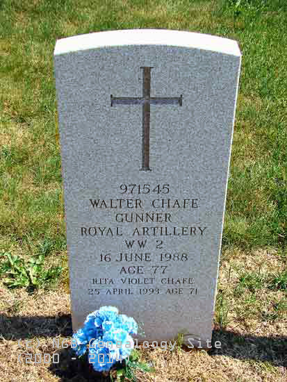 | 971545 Walter Chafe Gunner - Royal Artillery WW II 16 Jun 1988 Age 77 Rita Violet Chafe 25 Apr 1999 Age 71 |