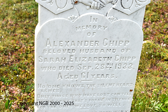 | ALEXANDER CHIPP Died: Sept 28th 1933 Aged: 61 Years Beloved Husband of Sarah Elizabeth Chipp |