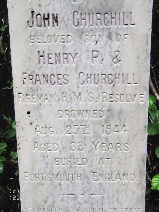 | John Churchill Beloved Son of Henry P. & Frances Churchill Fireman ~ H.M.S. Resolve Drowned Aug 25th 1944 Aged 33 Years Buried At Portsmouth, England ~ He Maketh The Storm To Cease |