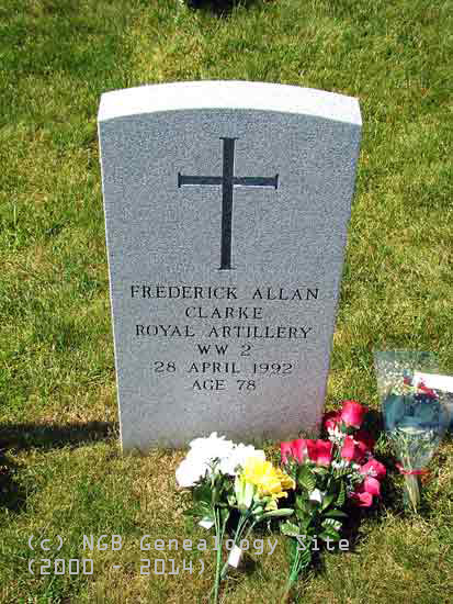 | Frederick Allan Clarke Royal Artillery WW II 28 Apr 1992 Age 78 |