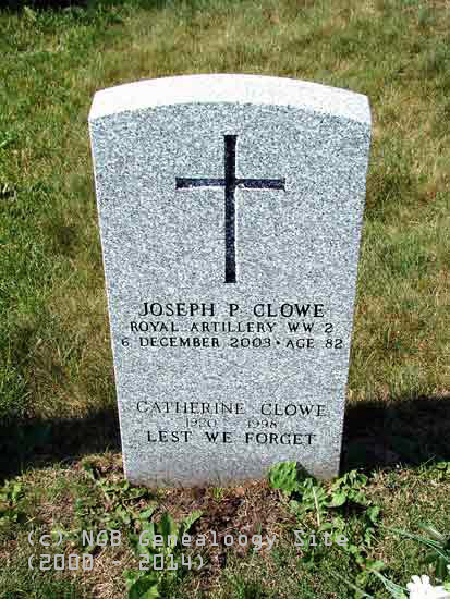 | Joseph P. Clowe Royal Artillery. WW II Age 82 Catherine Clowe 1920-1998 Lest We Forget |