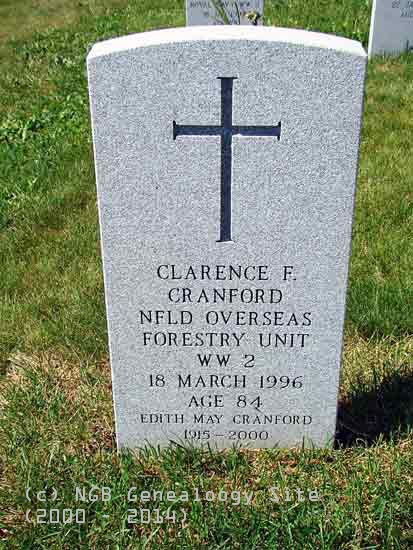 | Clarence F. Cranford Newfoundland Overseas Forestry Unit WW II 18 Mar 1996 Age 84 Edith May Cranford 1915-2000 |
